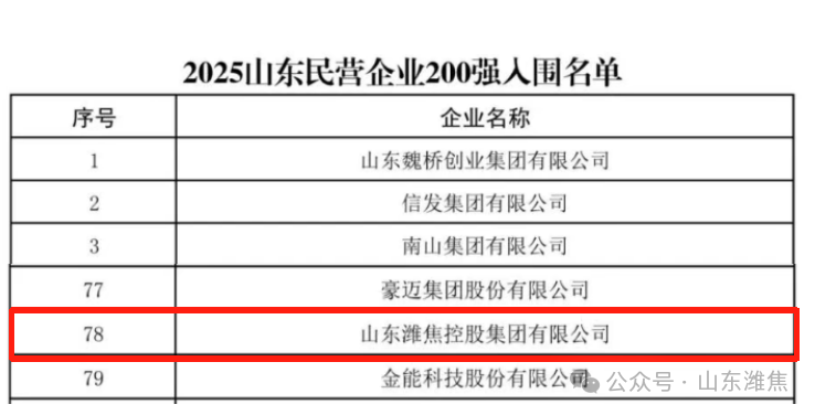 近日,山東省工商聯、省發(fā)展改革委、省科技廳、省人力資源社會保障廳、省農業(yè)農村廳、省商務廳、省稅務局、省市場監(jiān)管局、省總商會共同組織開展了2025山東民營企業(yè)百強系列榜單發(fā)布活動。山東濰焦控股集團有限公司榮登“2025山東民營企業(yè)200強”第78位。