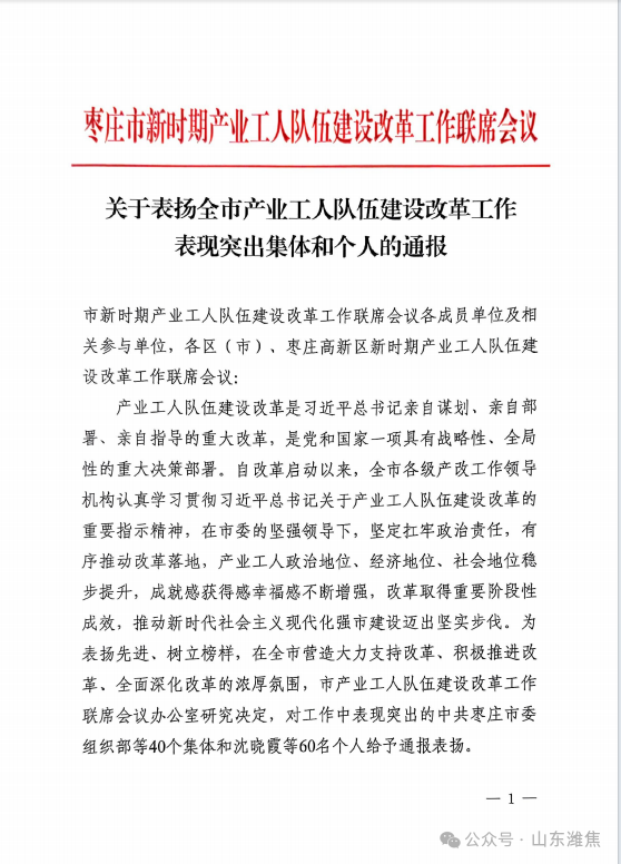 11月27日,棗莊市新時期產(chǎn)業(yè)工人隊伍建設(shè)改革工作聯(lián)席會議公布表彰名單,薛城能源公司榮獲“棗莊市產(chǎn)業(yè)工人隊伍建設(shè)改革工作表現(xiàn)突出集體”稱號。